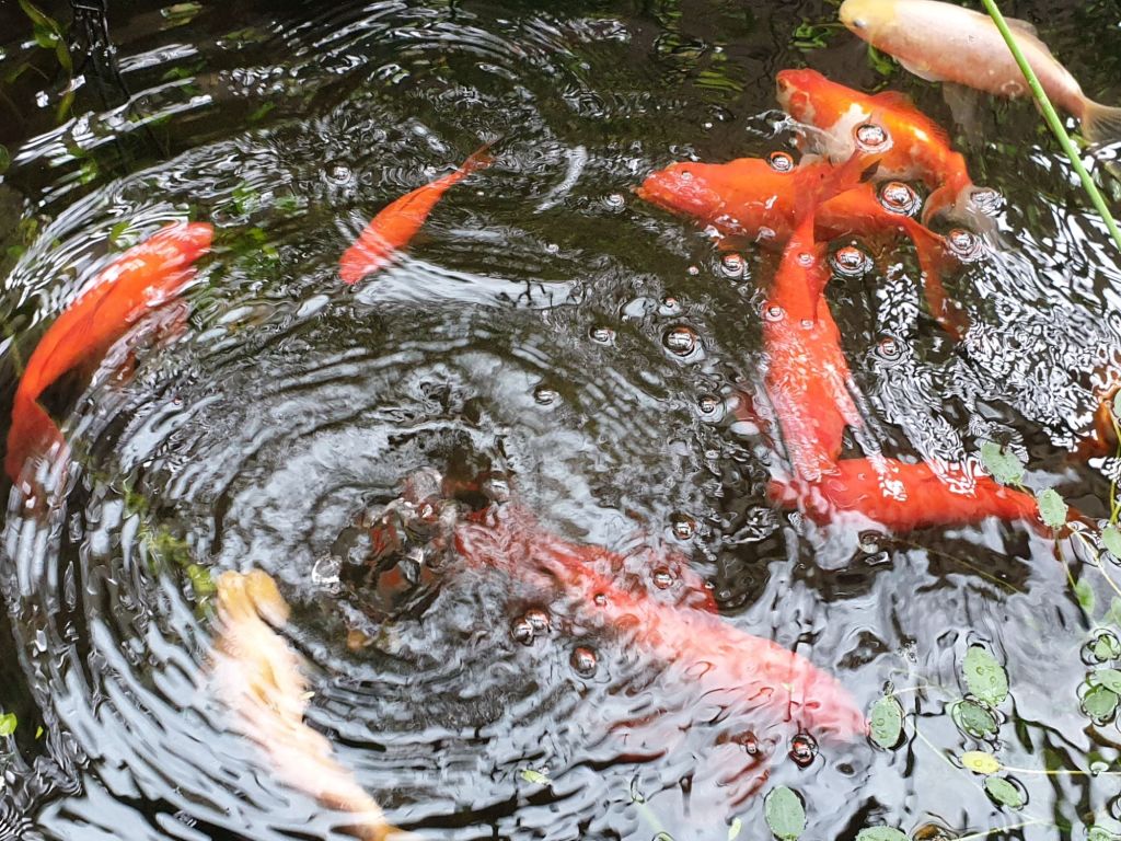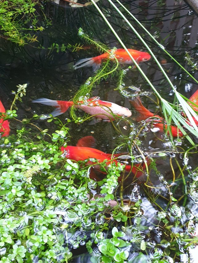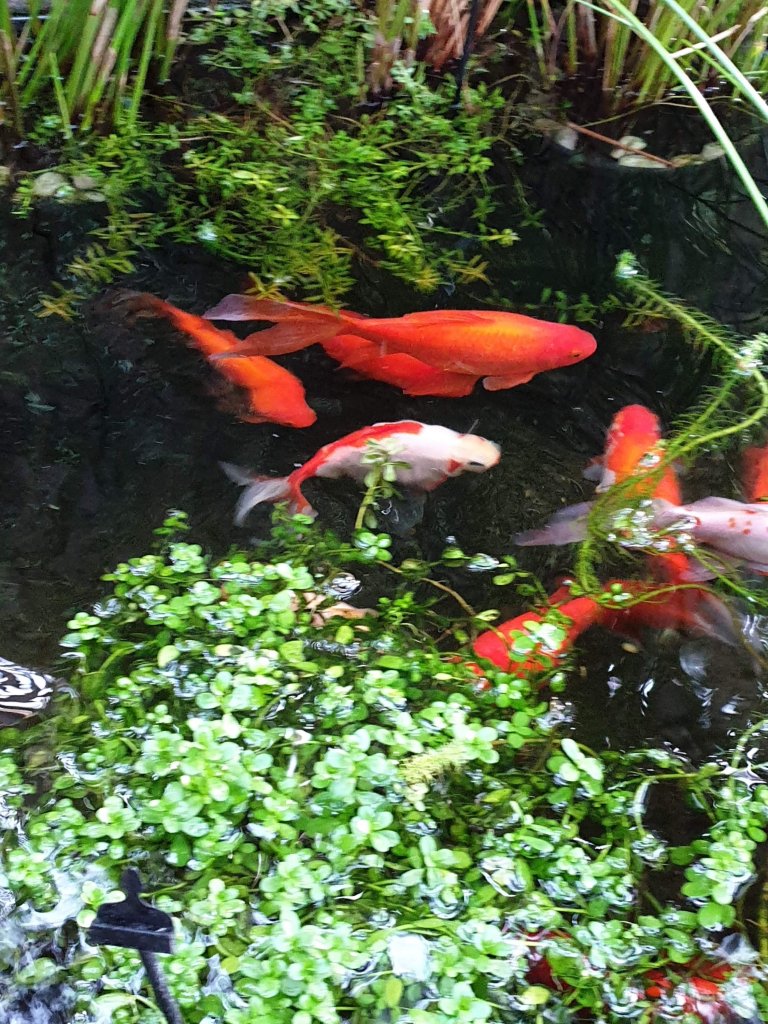 Our website is almost entirely neglected by the human. She concentrates on the cat because it has furs, we think. But she does care for us every day. She throws our food into the pond: pellets of different sizes, flake food, shelled peas, and brine shrimp. Then, she stares at our bright and beautiful bodies as we swim and play in our new fountain, then dart to the water falling from the dragon fountain. Someone from the aquarium company comes each month to give the pond a more vigorous clean. She changes part of our water by herself in between.