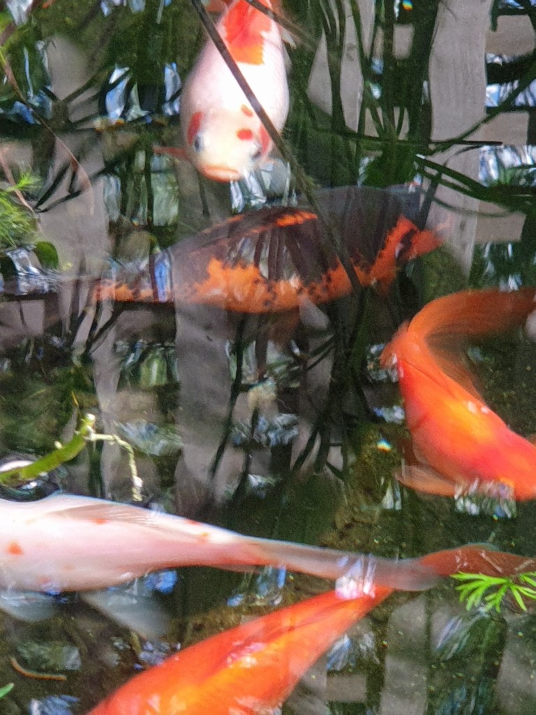 Our website is almost entirely neglected by the human. She concentrates on the cat because it has furs, we think. But she does care for us every day. She throws our food into the pond: pellets of different sizes, flake food, shelled peas, and brine shrimp. Then, she stares at our bright and beautiful bodies as we swim and play in our new fountain, then dart to the water falling from the dragon fountain. Someone from the aquarium company comes each month to give the pond a more vigorous clean. She changes part of our water by herself in between.